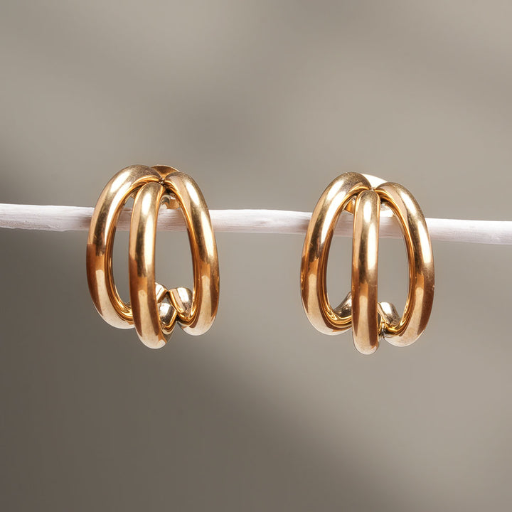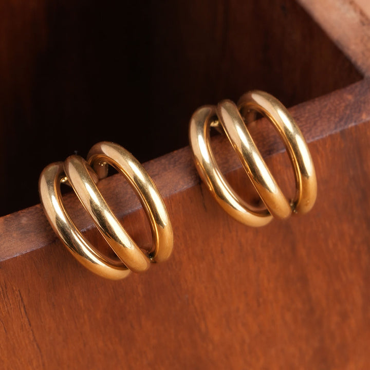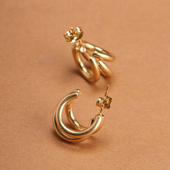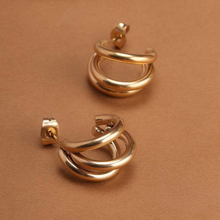 Twist up your style game. Our Twisted Triple Hoops are crafted from stainless steel and plated in an 18K gold tone, made especially for you. Designed to make a bold yet elegant statement, these hoops add dimension and shine to your look - perfect for your day-to-night transitions.
