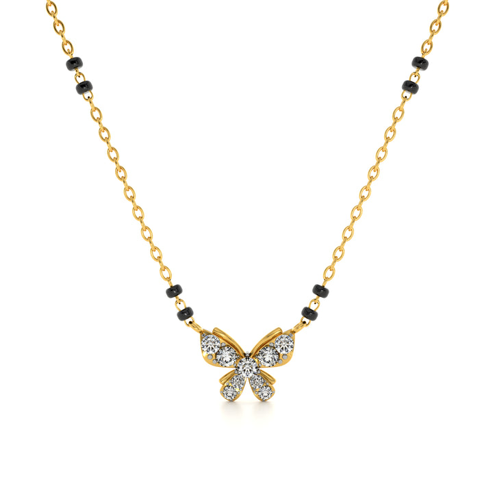 The Wings of Grace Lab Grown Diamond Mangalsutra takes inspiration from freedom and elegance, featuring a butterfly-shaped design adorned with shimmering diamonds. The motif symbolizes transformation, beauty, and love’s enduring journey. Each lab grown diamond radiates brilliance, highlighting the pendant’s delicate details. A modern yet timeless design, this mangalsutra beautifully blends tradition with artistry, making it a graceful emblem of marital unity and everlasting devotion.