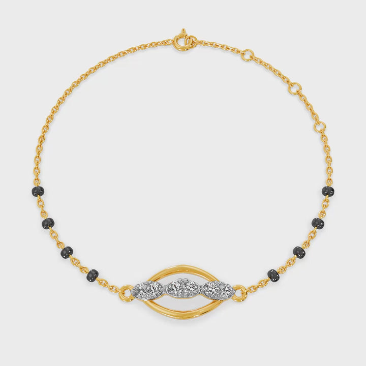 A sleek mangalsutra pendant featuring an open oval frame accented with marquise-shaped polki-style stones. Finished in a warm gold tone with classic black bead detailing, this elegant design is perfect for everyday wear and effortless styling with both ethnic and modern outfits.