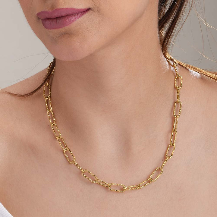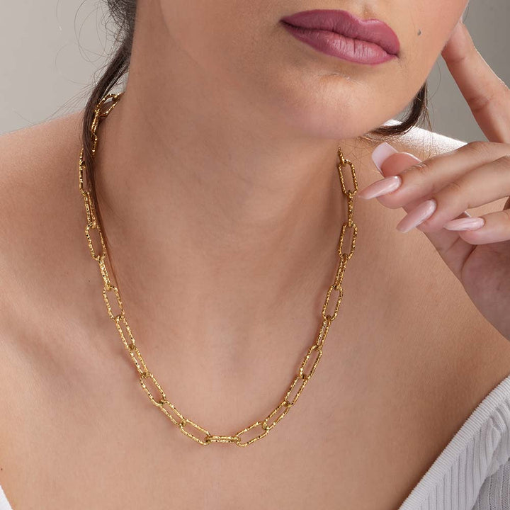 The Shimmering Link Chain Necklace is a bold, modern jewellery statement. Crafted in 18k gold-plated stainless steel, its oversized links catch the light beautifully, adding texture and shine to any ensemble. Perfect for layering or wearing solo, this necklace elevates both casual and evening looks, offering contemporary sophistication and a standout style element for every occasion.